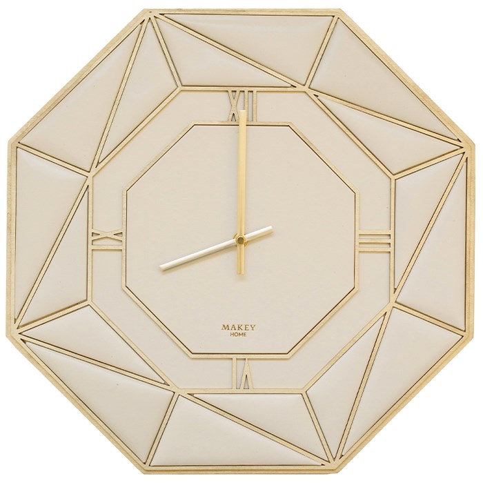 Часы из натуральной кожи с геометрическими деревянными вставками с позолотой идеально дополнят стильный лаконичный интерьер.