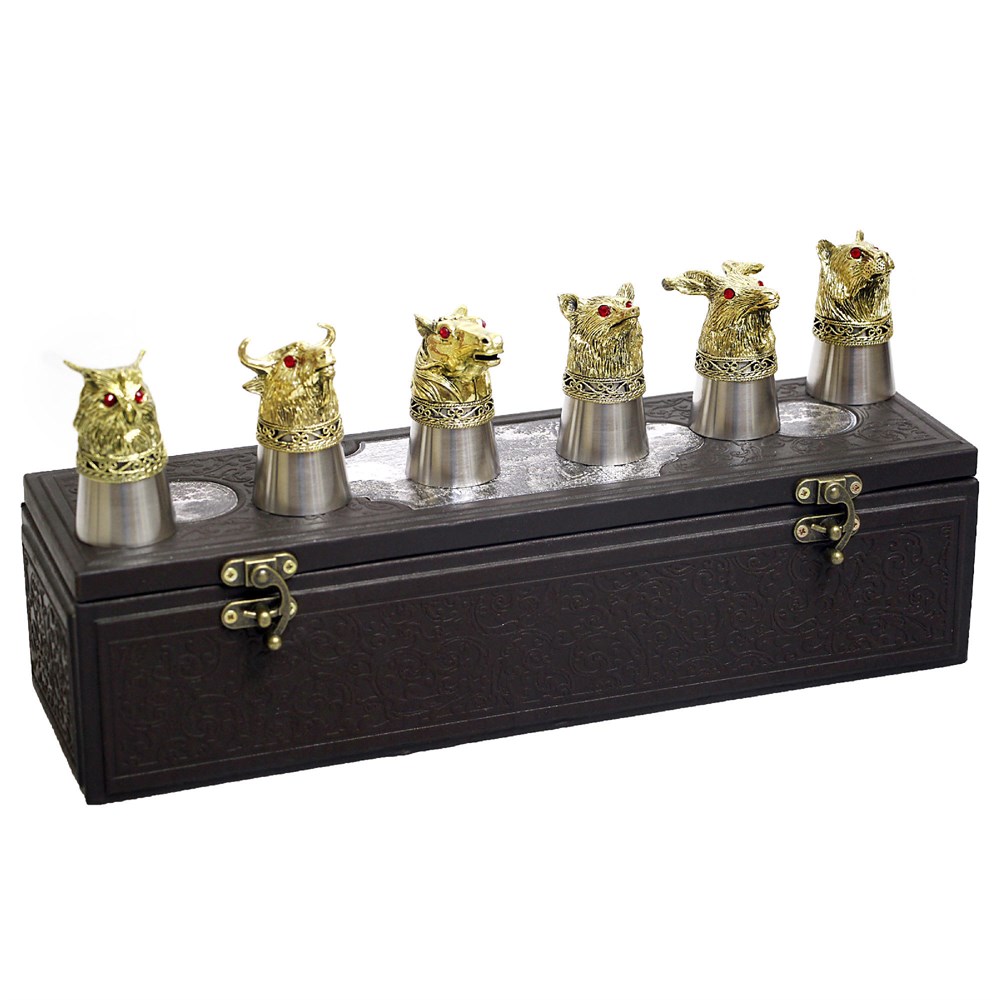 Стопки перевертыши с головами животных хороши и для пикника в кругу друзей и незаменимы для человека увлеченного охотой, поскольку они символизируют удачную охоту.