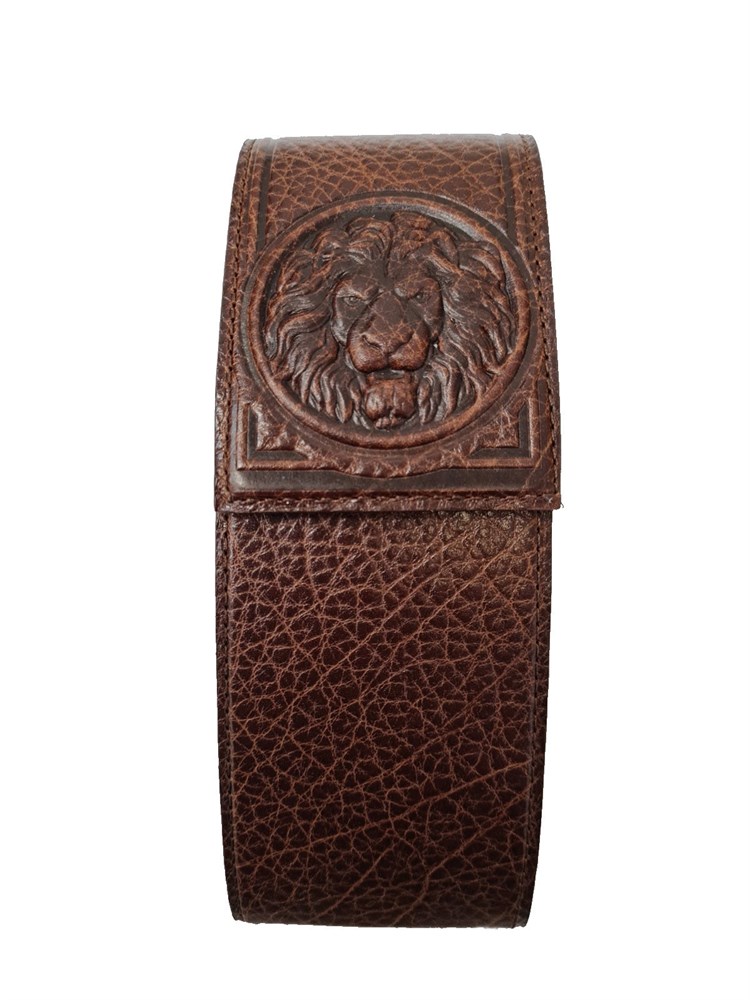 Предлагаемая модель подойдет для очков в оправе из любого материала любой формы. Благодаря уплотненному жесткому каркасу футляра, очки будут надежно сохранены от механических повреждений. Закрывается футляр на клапан с магнитной кнопкой, что предотвратит выпадение очков. Отличаясь своей долговечностью и надежностью, футляр для очков из натуральной кожи сохранит ваши очки, станет прекрасным подарком на любой случай. Данная модель с нестандартным дизайн-решением – выбор неординарной, яркой личности. Художественная вставка, эмблема в виде головы Льва, выполненная техникой декоративной гравировки по коже, выделяет такое сувенирное изделие среди других футляров для очков.